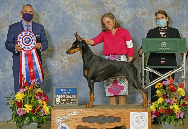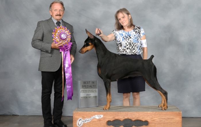 My Best of Breed bitch had many wonderful qualities. To begin, her overall first impression is very pleasing. She exudes breed type, is a sound mover, and has the attitude that is undeniably that of a Doberman. It was very special to learn that she was breeder, owner handled.